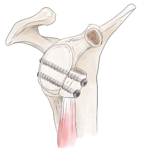 Augmentation de la surface articulaire par la pose du prélèvement de la coracoïde affleurante à la glène