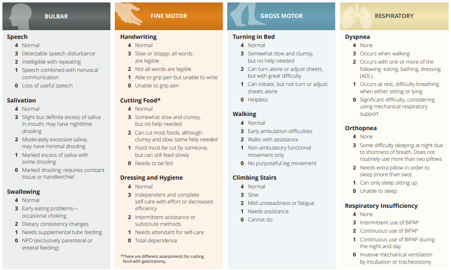 But : score de gravité spécifique à la maladie qui reflète les troubles moteurs et la détérioration fonctionnelle chez les personnes atteintes de sclérose latérale amyotrophique (SLA).
