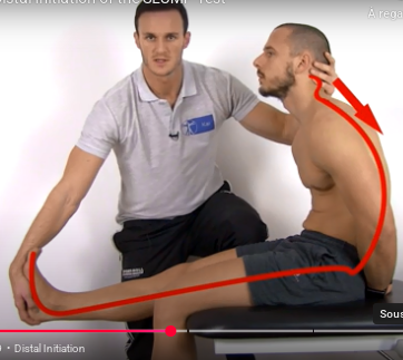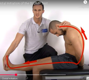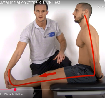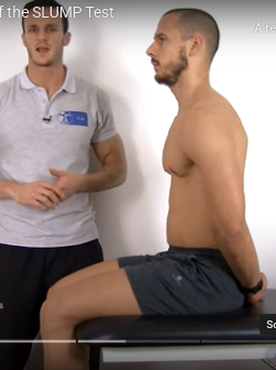 The Slump test is a very provocative dural test that poses maximal stress on the dura. If you suspect a severe disc prolapse or extrusion with radicular pain, we do not recommend performing it, as excessive lumbar flexion puts additional stress on the discus and symptoms can usually already be provoked sufficiently with a straight leg raise test according to Lasegue or by simply asking your patient to perform forward flexion of the trunk in standing with straight knees.