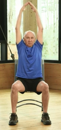 Puis extension thoracique et élévation des bras, mains se touchent au-dessus de la tête